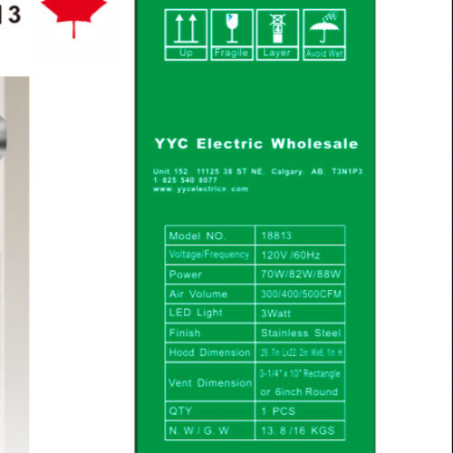 RIGID Range Hood Stainless Steel, 3- Speed 100/200/350, Rectangle or 6" Round Vent (LYD-18813) (50780)